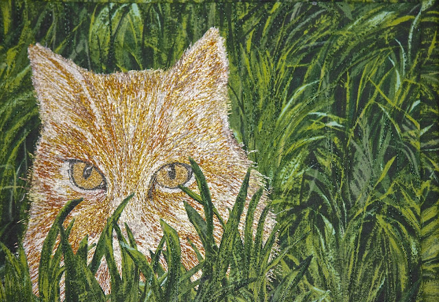 This is a thread painting of my cat Jackson. I adopted Jackson 10 years ago. He had been brought into the vet clinic in very bad shape. After 6-8 weeks of recovery at the vet, I brought him home. The vet thought he was probably 2-3 years old at the time I adopted him. So he is now probably about 12-13 years. I have noticed he is pretty thinned down. He is a lot more social. Always needs to be sitting on me, or at least very near me. He does not climb our 6 foot fence to hunt anymore. He tolerates our dog Ruger and loves our dog Teton.